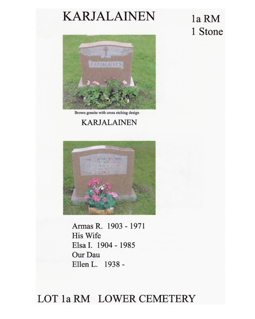 Plot Data: BLOCK: Right | LOT #: 2a RM | PEOPLE BURIED THERE: Valerie Karjalainen | LAST NAME: Karjalainen | DATE OF DEATH: 36368