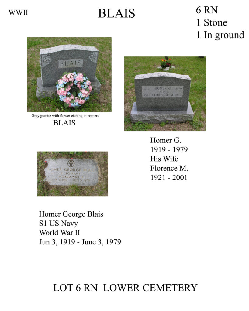 Plot Data: BLOCK: Right | LOT #: 6 RN | PEOPLE BURIED THERE: Florence M. Blais | LAST NAME: Blais | DATE OF DEATH: 2001