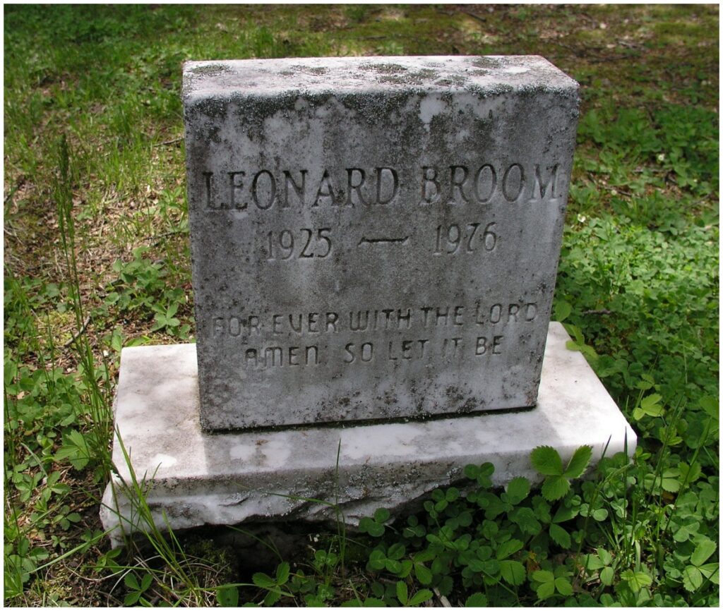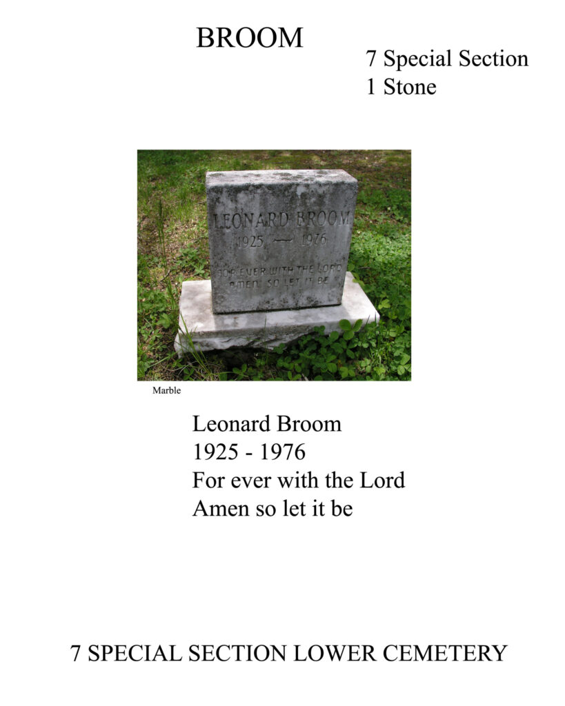 BLOCK: SS | LOT #: 7 | LOT SIZE: 1 | USED: 1 | LOT OWNER # 1: Broom | PEOPLE BURIED THERE: Leonard Broom | LAST NAME: Broom | DATE OF DEATH: 1976