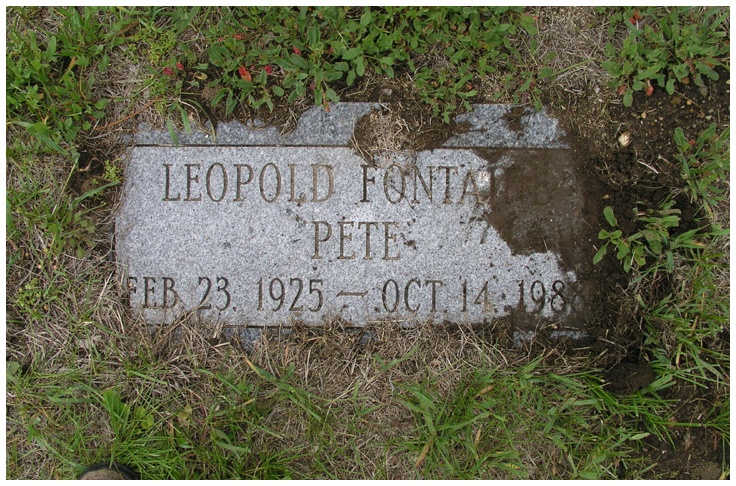Plot Data: BLOCK: Right | LOT #: 4 RN | LOT SIZE: 8 | LOT OWNER # 1: Thomas Fontaine | PEOPLE BURIED THERE: Leopold A. "Pete" Fontaine | LAST NAME: Fontaine | DATE OF DEATH: Oct. 14 1988 | BURIAL DATE: Oct. 18 1988