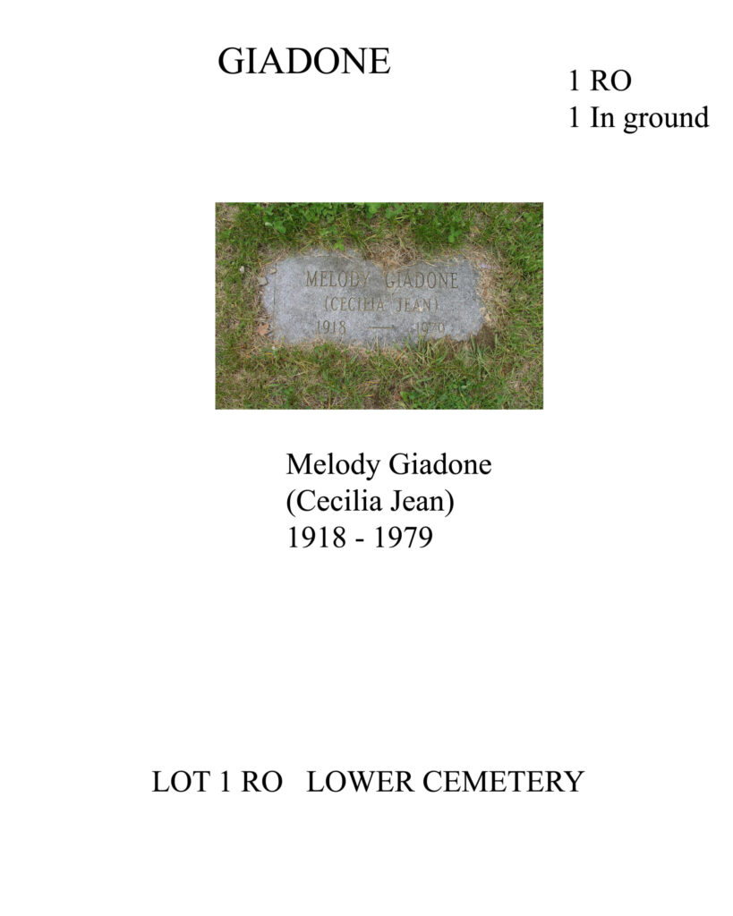 BLOCK: Right | LOT #: 1 RO | LOT SIZE: 4 | USED: 1 | LOT OWNER # 1: Barbara Manty | PEOPLE BURIED THERE: Melody (Cecilia Jean) Giadone | LAST NAME: Giadone | DATE OF DEATH: 1979