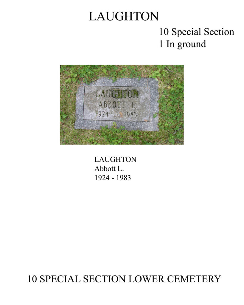 BLOCK: SS | LOT #: 10 | LOT SIZE: 1 | LOT OWNER # 1: Laughton | PEOPLE BURIED THERE: Abbott L. Laughton | LAST NAME: Laughton | DATE OF DEATH: 1983 | FULL: Ashes