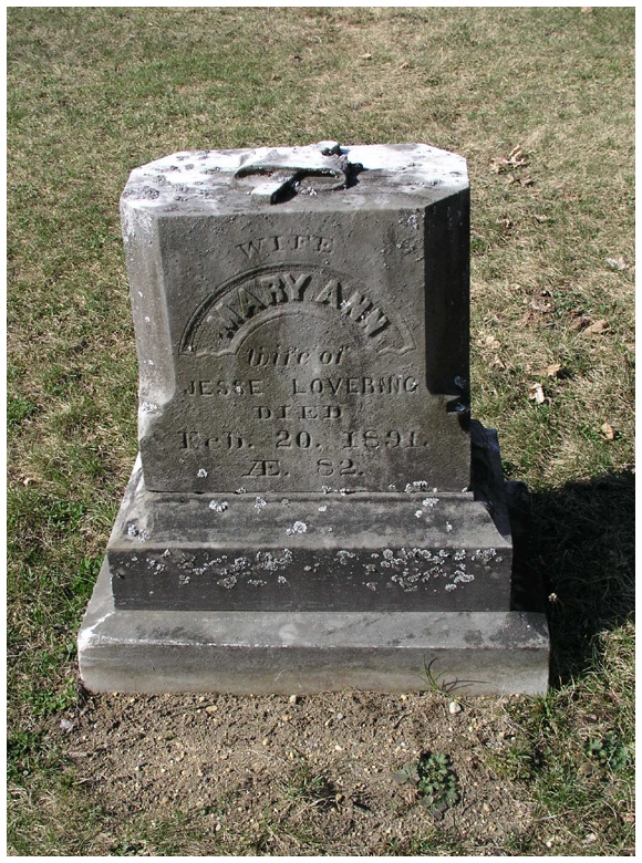 Plot Data: BLOCK: Right | LOT #: 3 D | PEOPLE BURIED THERE: Mary Ann Lovering | LAST NAME: Lovering | AGE: 82 yrs | DEATH: Feb. 20 1891