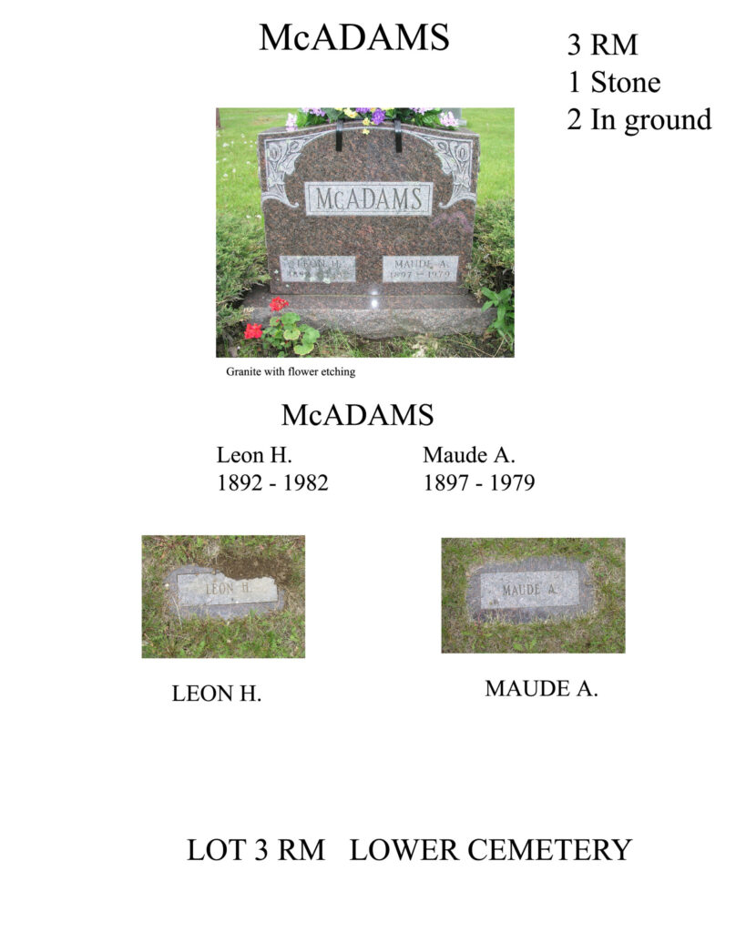 Plot Data: BLOCK: Right | LOT #: 3 RM | PEOPLE BURIED THERE: Leon McAdams | LAST NAME: McAdams | DATE OF DEATH: 1982