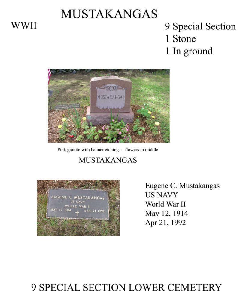 BLOCK: SS | LOT #: 9 | LOT OWNER # 1: Mustakangas | PEOPLE BURIED THERE: Eugene C. Mustakangas | LAST NAME: Mustakangas | DATE OF DEATH: Apr. 21 1992 | VETERAN: WWII